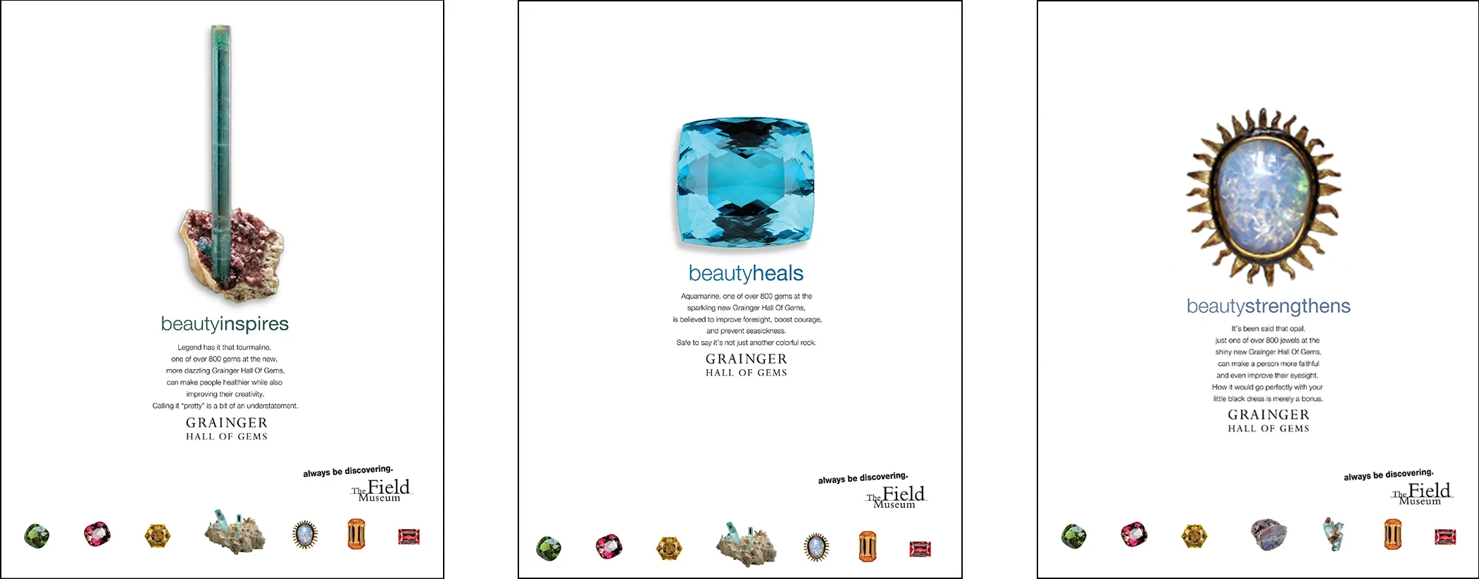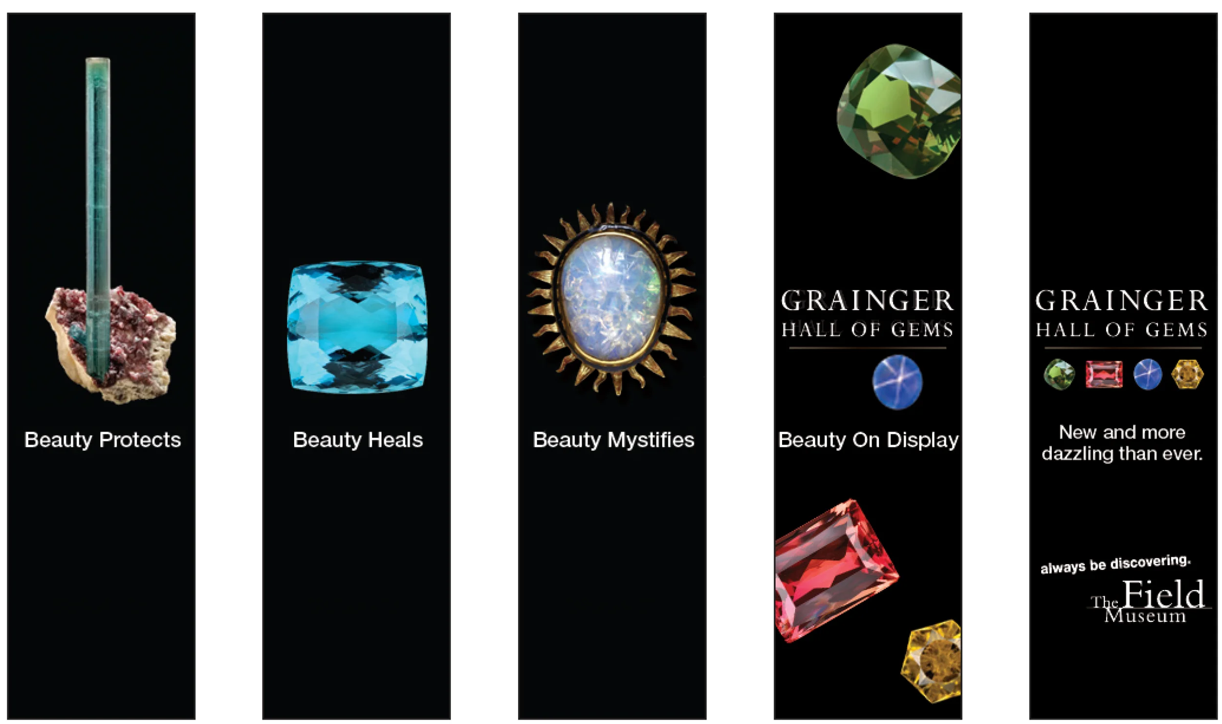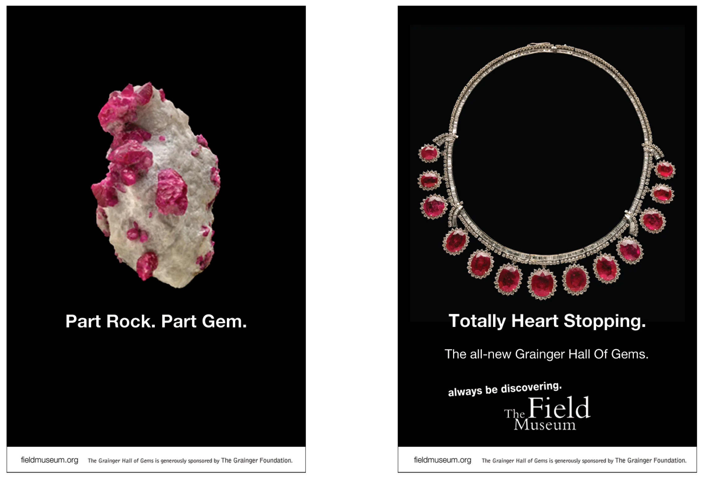 The Field Museum of Chicago was highlighting two gems shows simultaneously. One was a jewelry exhibit and the other featured the actual minerals and stones that are mined for gems. So the advertising had to incorporate both.